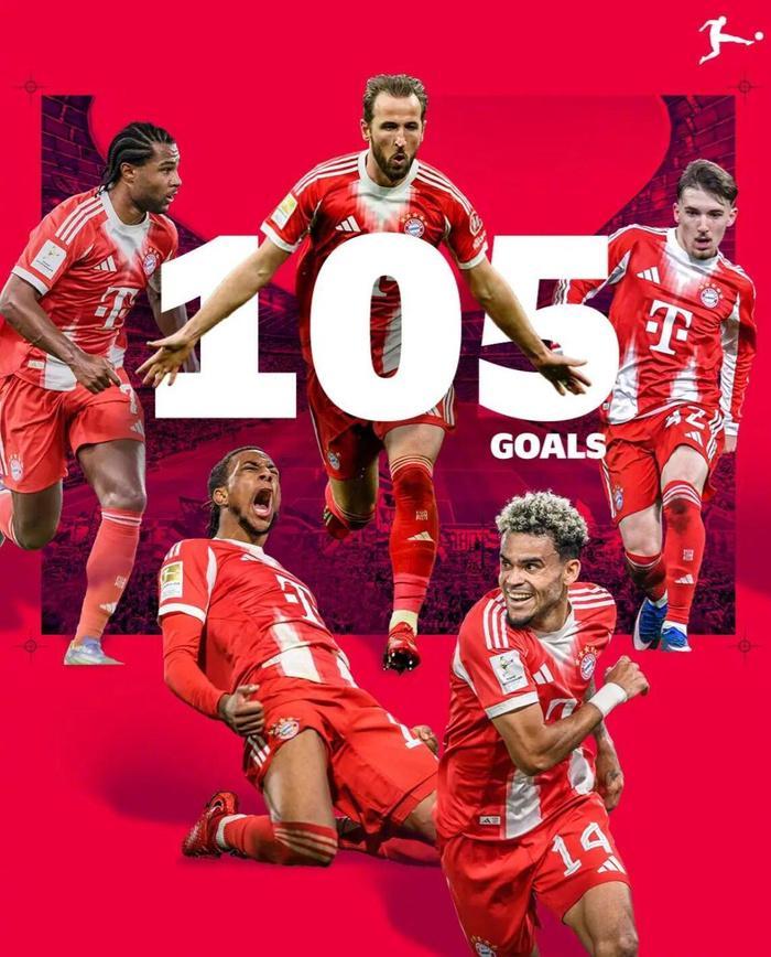 第29轮5比0战胜圣保利之后,拜仁本赛季德甲打入105球,刷新德甲单赛季进球纪录。此前纪录是拜仁在1971-72赛季创造,当时共打入101球。